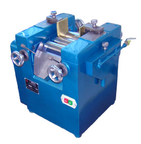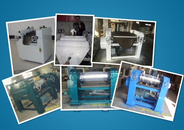 該設備由三個輥筒組成,裝在一個機架上,由電機直接帶動。一般輥筒間的轉動方向不同,前輥向前轉動,中輥向后轉動。輥子轉速前輥快、后輥慢。中間輥固定,前后兩輥裝在滑道上,有彈簧裝置,用手輪調節前后輥與中輥的距離。物料由后輥與中輥之間進入,受到輥筒的擠壓,產品顆粒變細,然后由快輥帶出,快輥末端裝有刮刀,使物料與輥筒分離,落入收集桶內。由于研磨過程產生大量熱量,各輥筒的中心是設計為空心結構,通水冷卻,保證產品質量。
